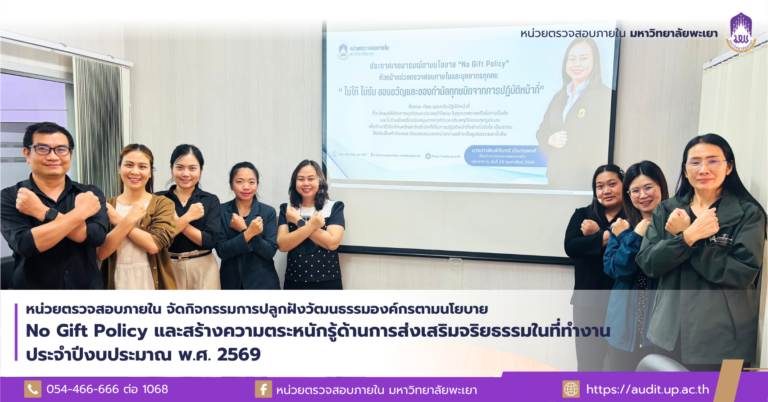 หน่วยตรวจสอบภายใน จัดกิจกรรมการปลูกฝังวัฒนธรรมองค์กรตามนโยบาย No Gift Policy จากการปฏิบัติหน้าที่ และสร้างความตระหนักรู้ด้านการส่งเสริมจริยธรรมในที่ทำงาน ประจำปีงบประมาณ พ.ศ. 2569