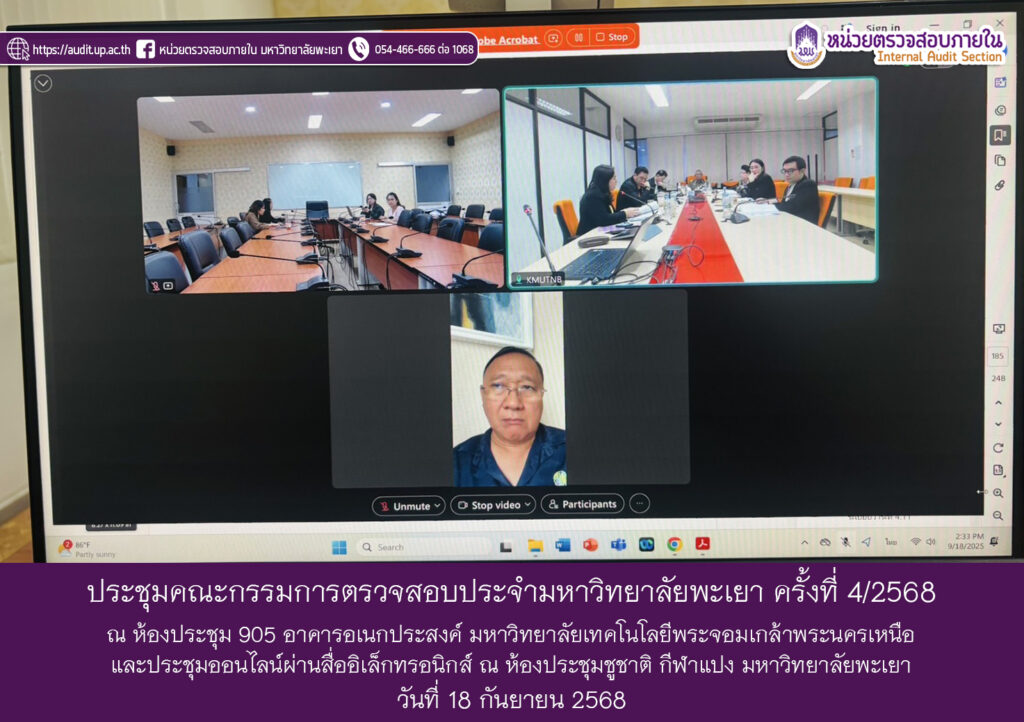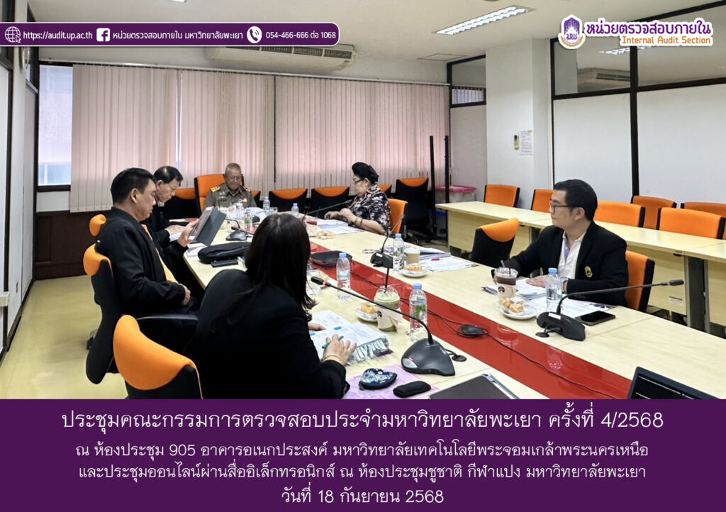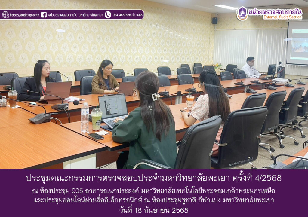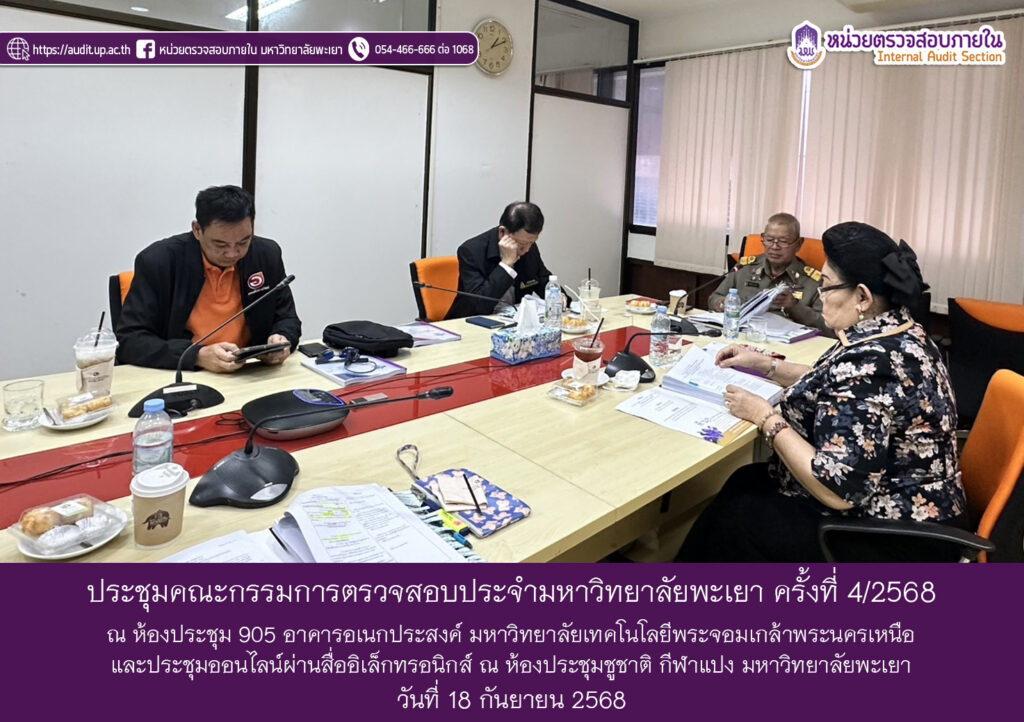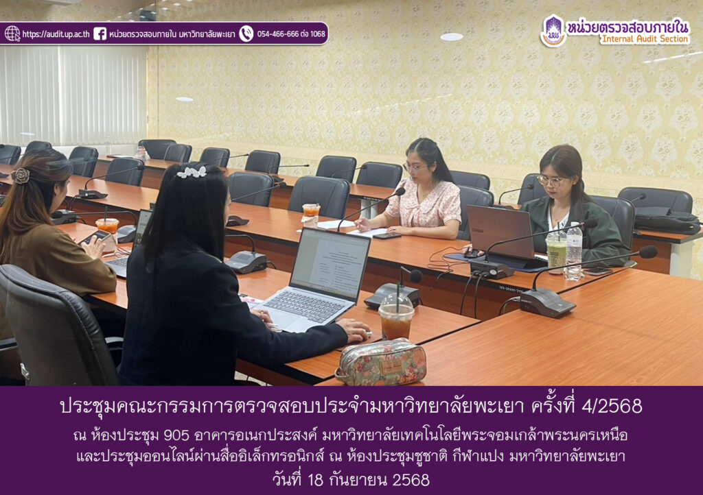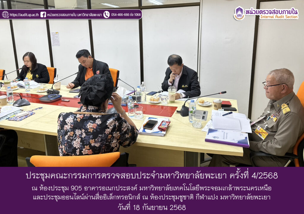 คณะกรรมการตรวจสอบประจำมหาวิทยาลัยพะเยากำหนดให้จัดการประชุมคณะกรรมการตรวจสอบประจำมหาวิทยาลัยพะเยา ครั้งที่ 4/2568 เมื่อวันพฤหัสบดีที่ 18 กันยายน 2568 เวลา 13.30 น. ณ ห้องประชุม 905 อาคารอเนกประสงค์ มหาวิทยาลัยเทคโนโลยีพระจอมเกล้าพระนครเหนือ และประชุมออนไลน์ผ่านสื่ออิเล็กทรอนิกส์ ณ ห้องประชุมชูชาติ กีฬาแปง มหาวิทยาลัยพะเยา