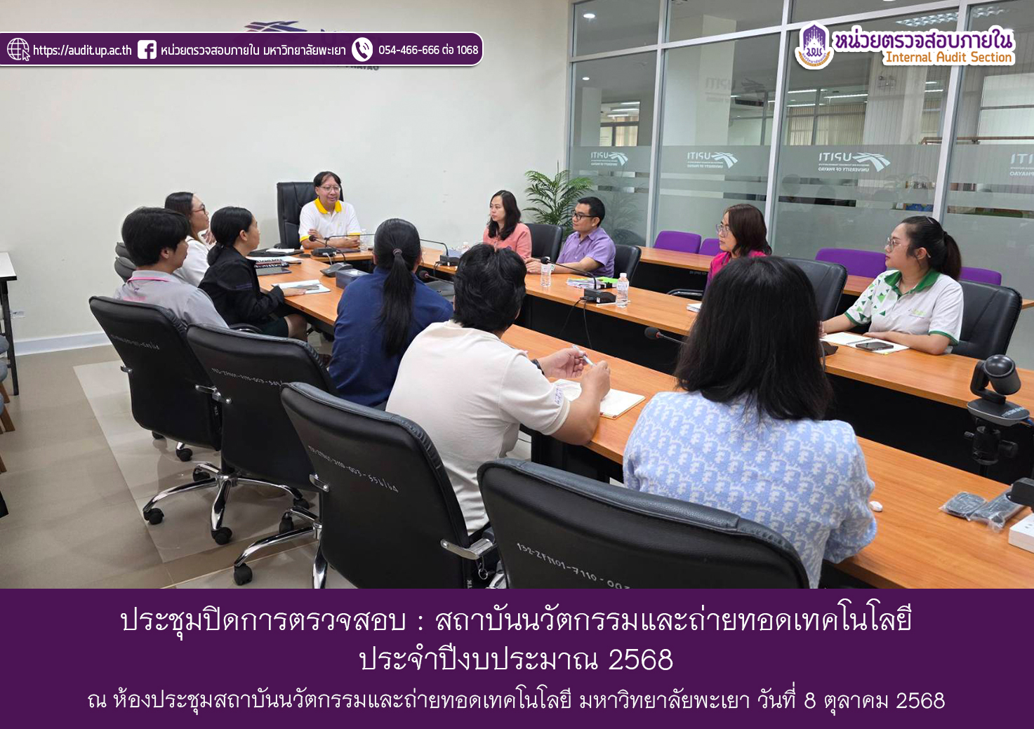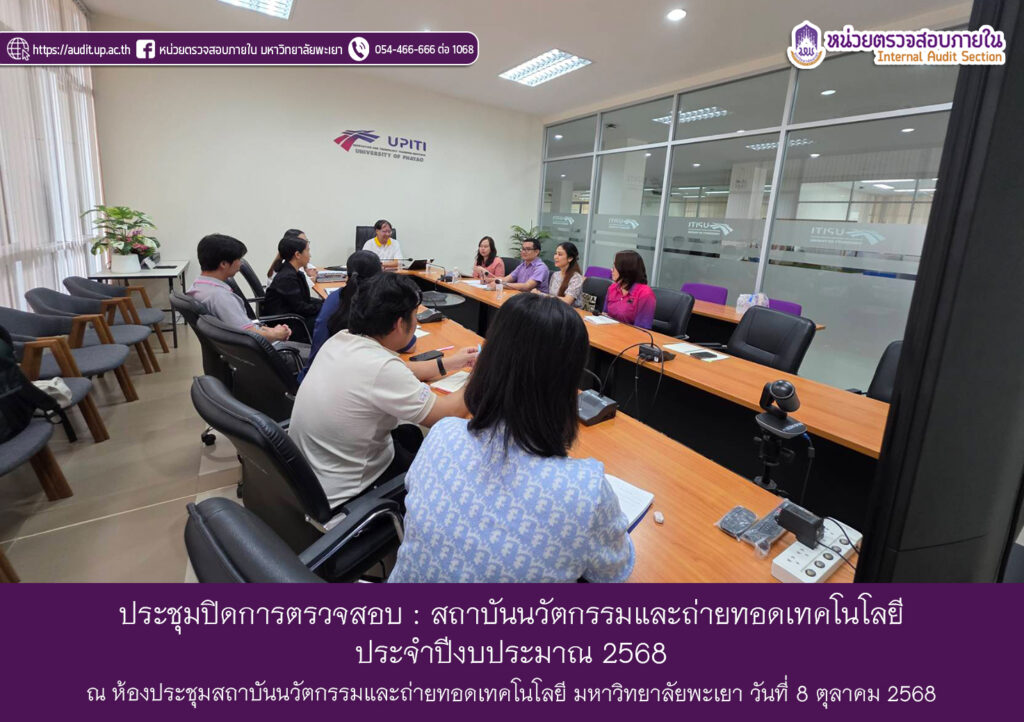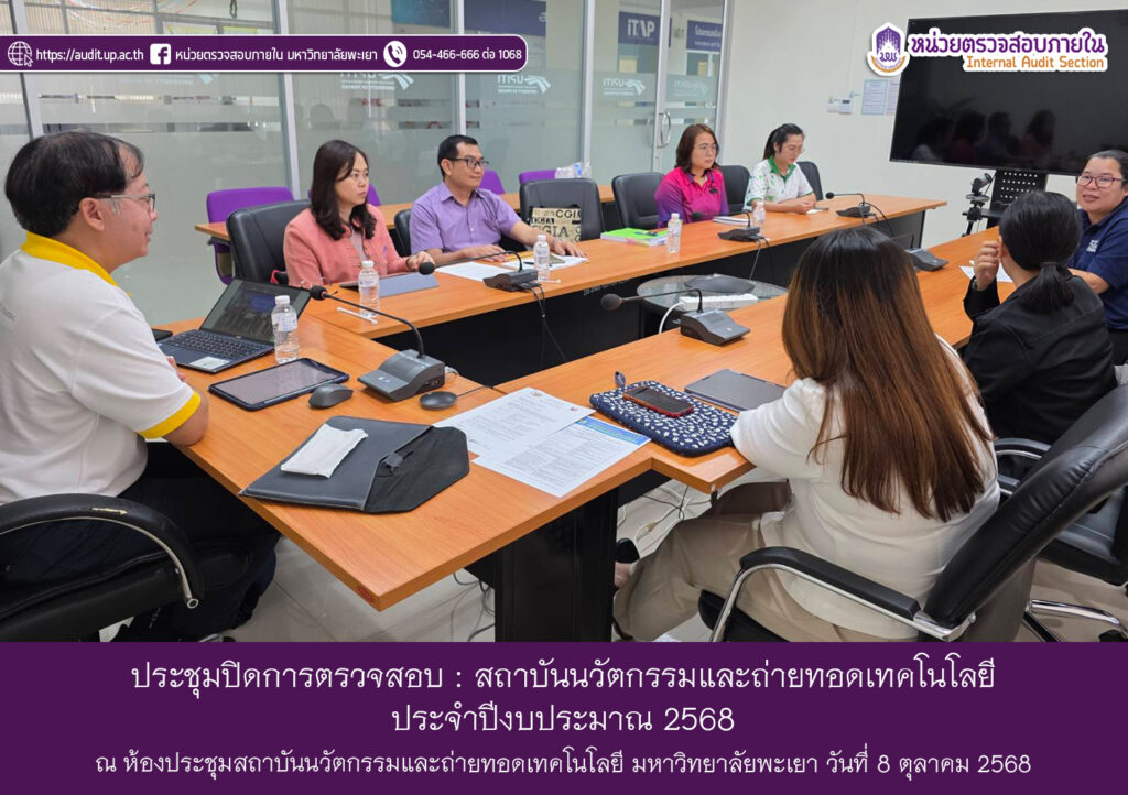 บุคลากรหน่วยตรวจสอบภายในประชุมร่วมกับ ผู้ช่วยศาสตราจารย์ ดร.สันธิวัฒน์ พิทักษ์พล ผู้อำนวยการสถาบันนวัตกรรมและถ่ายทอดเทคโนโลยี นางสาวกานต์พิชชา ปัญญา หัวหน้าสำนักงาน และบุคลากรที่เกี่ยวข้อง เพื่อแจ้งสิ่งที่ตรวจพบ และข้อเสนอแนะจากการตรวจสอบ ตามแผนการตรวจสอบภายใน ประจำปีงบประมาณ 2568 เพื่อยืนยันความถูกต้องของเรื่องที่ตรวจพบ โดยเปิดโอกาสให้หน่วยงานและหัวหน้าโครงการชี้แจง และแลกเปลี่ยนความคิดเห็นเกี่ยวกับเรื่องที่ตรวจพบ เมื่อวันพุธ ที่ 8 ตุลาคม 2568 เวลา 09.30 น. ณ ห้องประชุมสถาบันนวัตกรรมและถ่ายทอดเทคโนโลยี มหาวิทยาลัยพะเยา