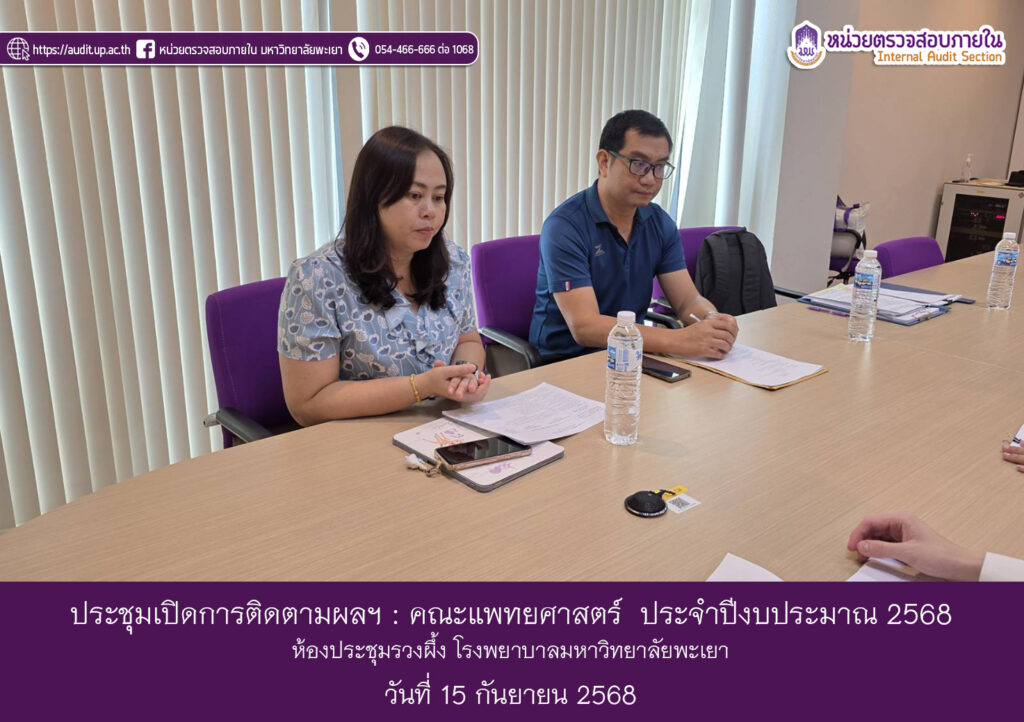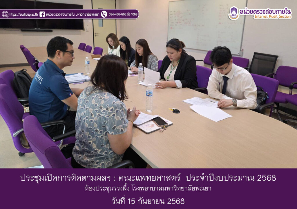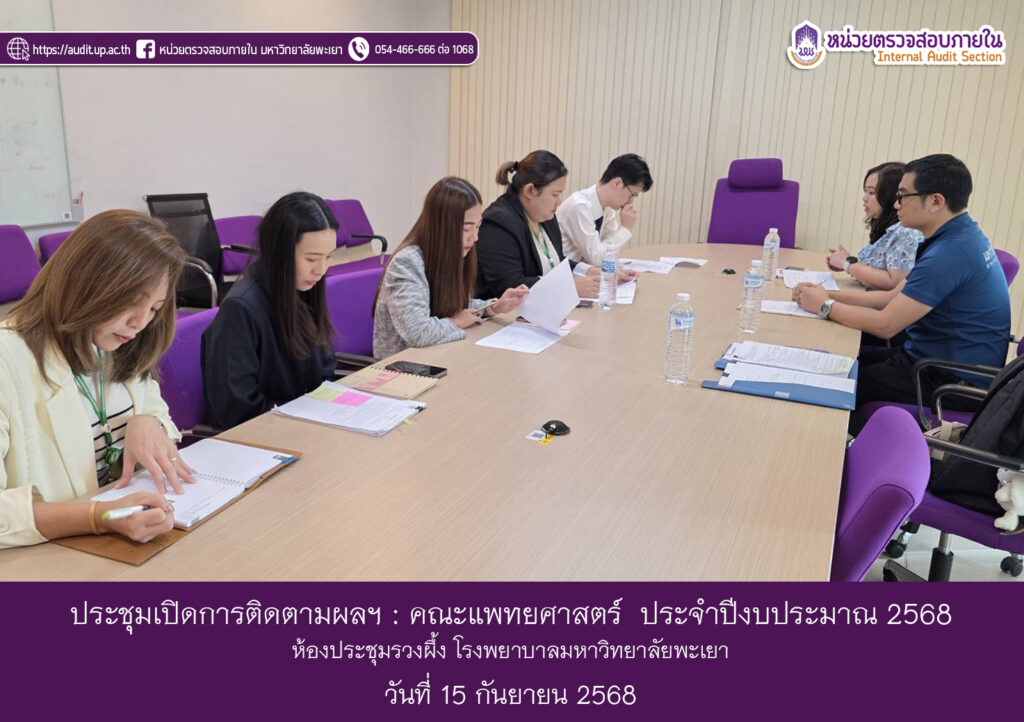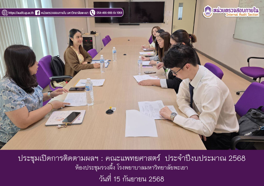 บุคลากรหน่วยตรวจสอบภายในประชุมร่วมกับ นายแพทย์สุทธิวัฒน์ เจียมตระกูล รองคณบดีฝ่ายยุทธศาสตร์และวิจัย พร้อมด้วยหัวหน้าสำนักงานคณะ และบุคลากรที่เกี่ยวข้อง เพื่อแจ้งวัตถุประสงค์และขอบเขตในการติดตามผลการปฏิบัติตามข้อเสนอแนะในรายงานผลการตรวจสอบที่อธิการบดีสั่งการ ตามแผนการตรวจสอบภายใน ประจำปีงบประมาณ 2568 เมื่อวันจันทร์ ที่ 15 กันยายน 2568 เวลา 09.00 น. ณ ห้องประชุมรวงผึ้ง โรงพยาบาลมหาวิทยาลัยพะเยา