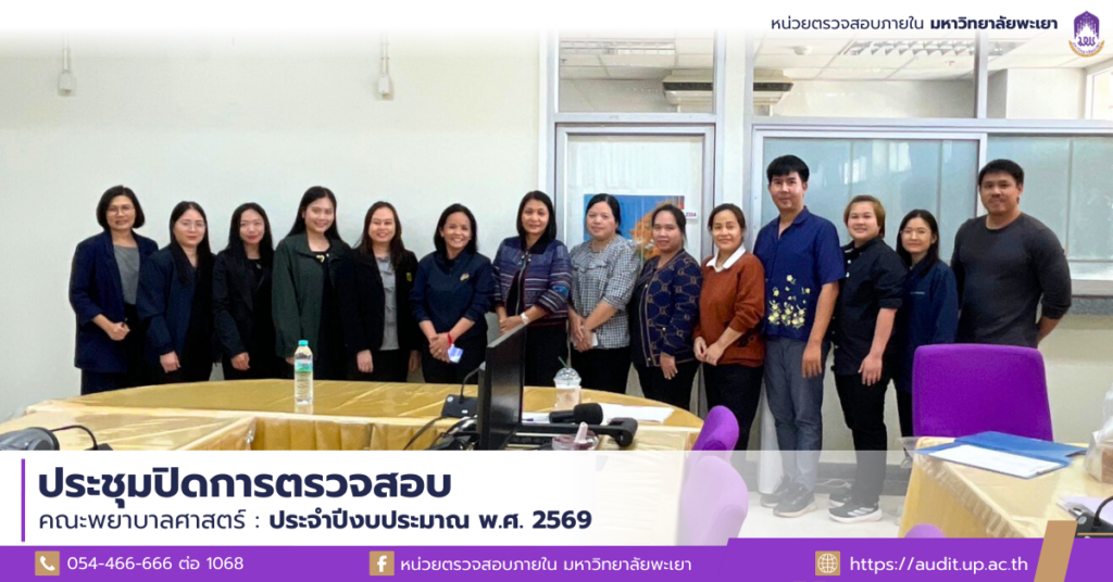 บุคลากรหน่วยตรวจสอบภายในประชุมร่วมกับ ผู้ช่วยศาสตราจารย์ ดร.ดาว เวียงคำ คณบดีคณะพยาบาลศาสตร์ หัวหน้าสำนักงาน และบุคลากรที่เกี่ยวข้อง เพื่อแจ้งสิ่งที่ตรวจพบ และข้อเสนอแนะจากการตรวจสอบตามแผนการตรวจสอบภายใน ประจำปีงบประมาณ พ.ศ. 2569 เพื่อยืนยันความถูกต้องและความเป็นจริงของเรื่องที่ตรวจพบ โดยเปิดโอกาสให้ส่วนงานชี้แจง รับฟัง และแลกเปลี่ยนความคิดเห็น รวมถึงหาข้อยุติเกี่ยวกับข้อตรวจพบ เมื่อวันศุกร์ ที่ 6 กุมภาพันธ์ 2569 เวลา 13.30 น. ณ ห้องประชุม 1 ชั้น 3 คณะพยาบาลศาสตร์ มหาวิทยาลัยพะเยา