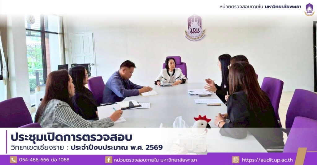 บุคลากรหน่วยตรวจสอบภายในประชุมร่วมกับ ผู้ช่วยศาสตราจารย์ ดร.ธิดาวัลย์ อุ่นกอง ผู้อำนวยการวิทยาเขตเชียงราย และบุคลากรที่เกี่ยวข้อง เพื่อแจ้งวัตถุประสงค์และขอบเขตในการตรวจสอบตามแผนการตรวจสอบภายใน ประจำปีงบประมาณ พ.ศ. 2569 เมื่อวันพุธ ที่ 24 ธันวาคม 2568 เวลา 10.30 น. ณ ห้องประชุมวิทยาเขตเชียงราย มหาวิทยาลัยพะเยา