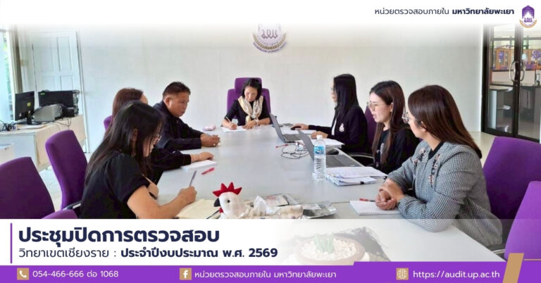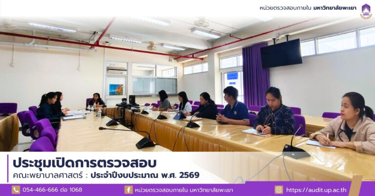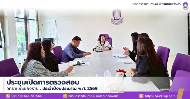 วันที่ 3 กุมภาพันธ์ พ.ศ. 2568 นางสาวพิมพ์จันทร์ บัณฑรพงศ์ หัวหน้าหน่วยตรวจสอบภายใน พร้อมด้วยบุคลากรหน่วยตรวจสอบภายใน จัดการประชุม ณ ห้องประชุมหน่วยตรวจสอบภายใน ชั้น 1 อาคารสำนักงานอธิการบดีมหาวิทยาลัยพะเยา